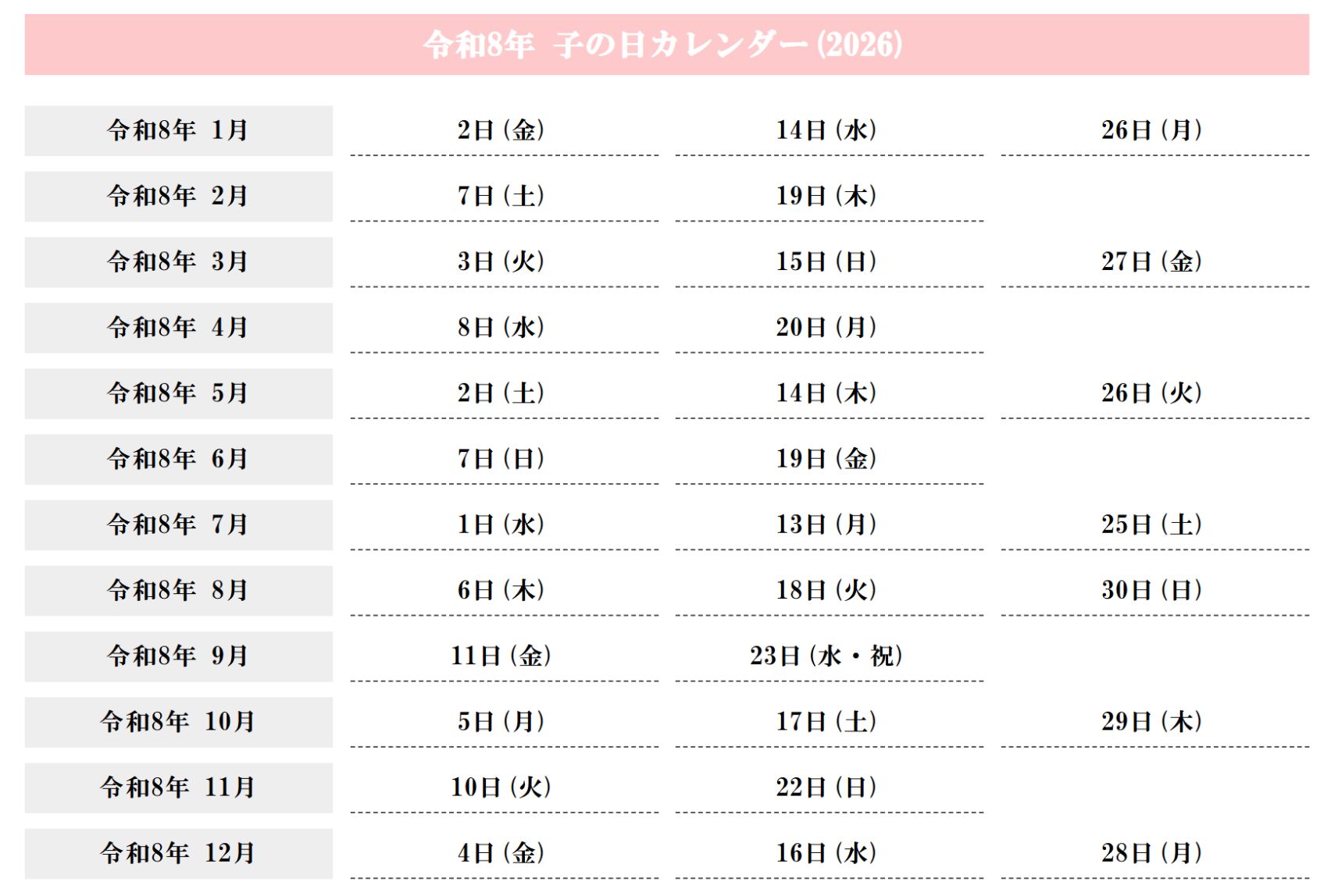 「子の日 カレンダー」と検索すれば日程を確認できます。